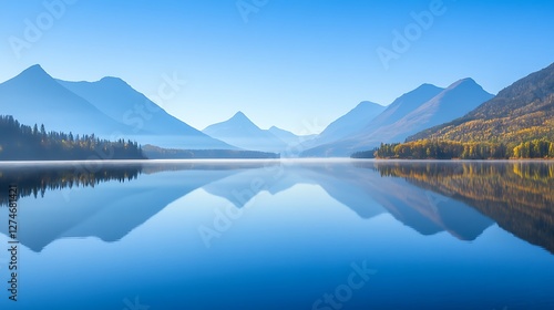 Fototapeta premium Serene mountain lake reflecting autumnal colors and peaks