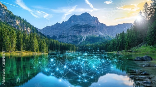 Fototapeta premium Serene Mountain Lake Reflecting Digital Network Connections