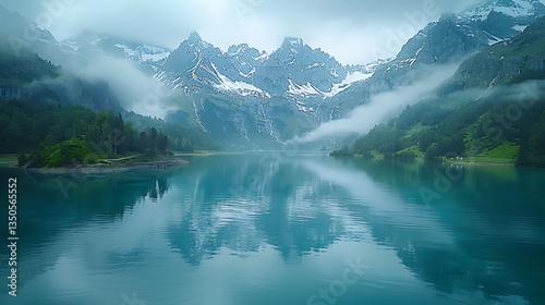 Naklejka premium Serene mountain lake reflecting misty peaks and lush greenery under a cloudy...