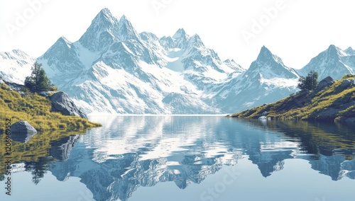 © adri, Fototapeta premium Serene mountain lake reflecting snow-capped peaks. (1)