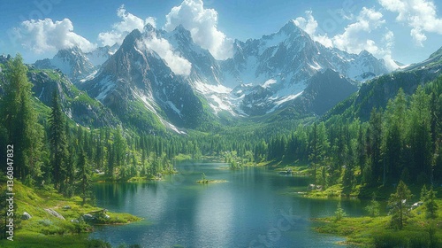 © bulegendut, Naklejka premium Serene mountain lake reflecting snow-capped peaks under a bright sky.