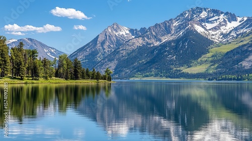 Fototapeta premium Serene mountain lake reflecting snow-capped peaks under a vibrant blue sky,...