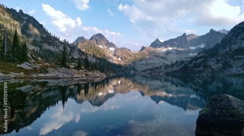 Fototapeta premium Serene Mountain Lake Reflection: A Stunning Panorama of Nature's Beauty