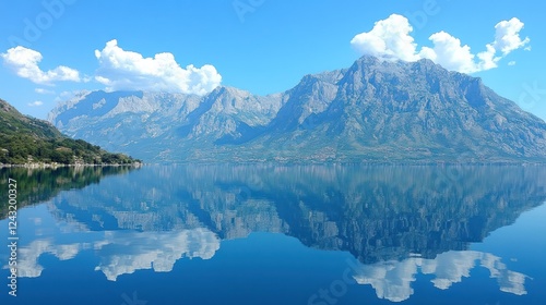 Naklejka premium Serene mountain lake reflection, idyllic landscape, azure water, and clouds...