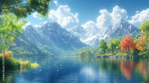 © Ali, Fototapeta premium Serene mountain lake reflects autumn colors.