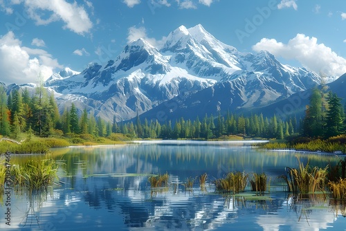 Fototapeta premium Serene Mountain Lake Reflects Snow-Capped Peak in Landscape