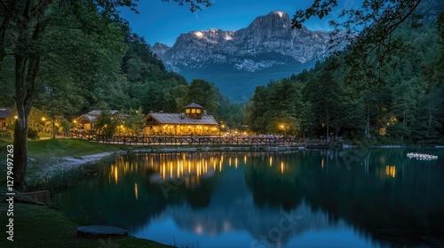 Fototapeta premium Serene Mountain Lake Resort at Dusk