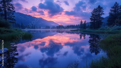 © BloomArt, Fototapeta premium Serene Mountain Lake Sunset Reflection Landscape