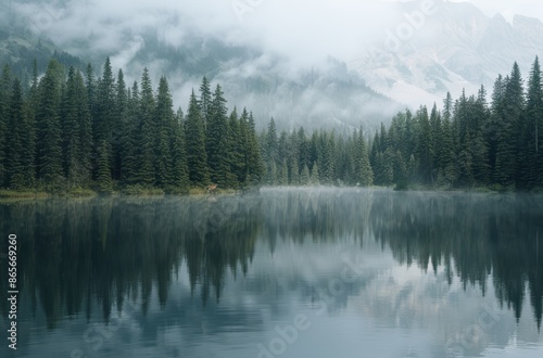 Obraz premium Serene mountain lake surrounded by misty pine forest