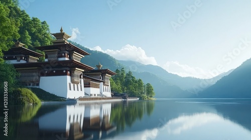© Slamet, Fototapeta premium Serene Mountain Lake Temple