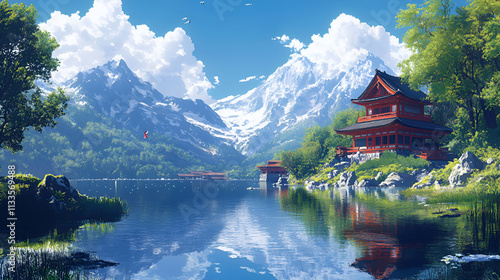 © Dodoodle, Fototapeta premium Serene Mountain Lake Temple Peaceful Landscape