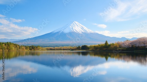Fototapeta premium Serene mountain lake with cherry blossoms
