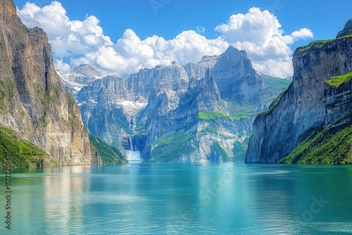 © NURDIYANNA, Obraz premium Serene Mountain Lake with Dramatic Clouds and Waterfall