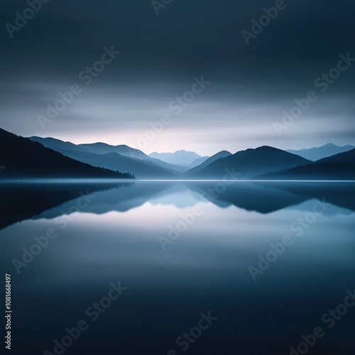 © Ishika, Fototapeta premium Serene mountain lake with dramatic cloudy sky reflected in the still waters