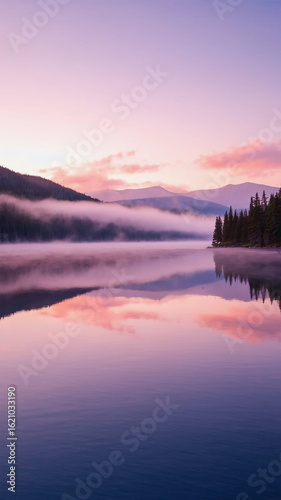 Fototapeta premium Serene mountain lake with mirror-like surface reflecting pastel fog and...