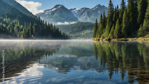 © Zekographic, Fototapeta premium Serene Mountain Lake with Misty Reflections