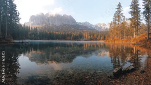 Fototapeta premium Serene Mountain Lake with Reflection of Pine Trees and Majestic Peaks Under Blue Sky in Autumn Colors