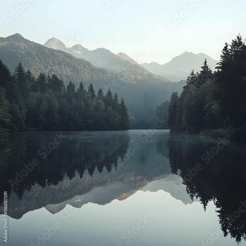 Naklejka premium Serene Mountain Lake with Tranquil Reflections and Towering Trees