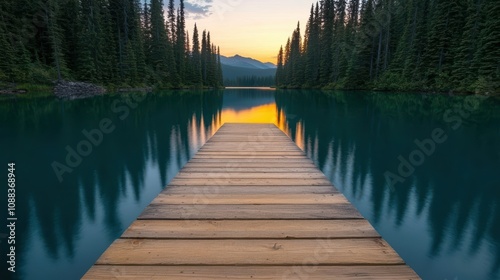 Fototapeta premium Serene mountain lake with wooden dock at sunset