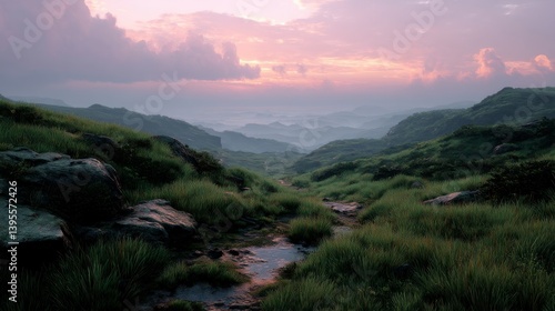© ขวัญฤทัย เฉลาชาญชัยย, Obraz premium Serene Mountain Landscape at Dawn with Gentle Mist and Soft Lighting
