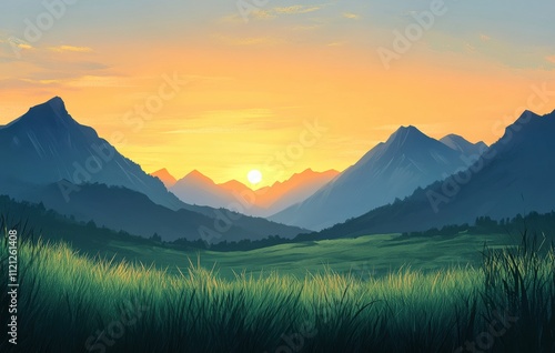 © ANUAR, Obraz premium Serene Mountain Landscape at Sunrise with Lush Green Grass and Majestic Peaks Illuminated by Warm Golden Light Over the Horizon