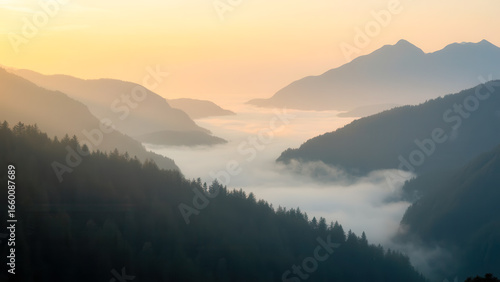 © KeetaKawee, Fototapeta premium Serene Mountain Landscape at Sunrise with Misty Valleys and Soft Light