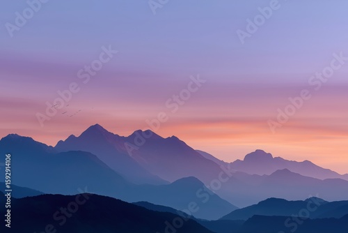 Fototapeta premium Serene mountain landscape at sunset with colorful sky and silhouette peaks