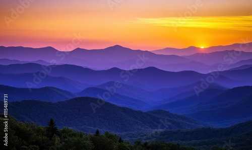 © Madhan, Fototapeta premium Serene mountain landscape at sunset with layered hills and vibrant colors.