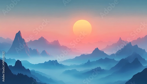 © Biggy, Fototapeta premium Serene Mountain Landscape at Sunset with Soft Gradient Sky