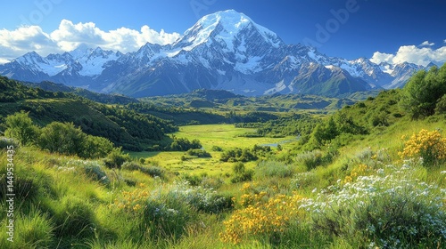 Fototapeta premium Serene mountain landscape, blooming wildflowers, grassy valley, snow-capped peak