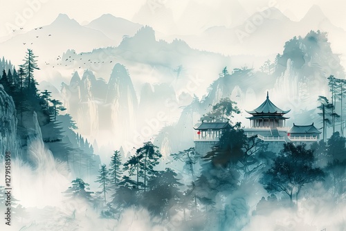 Fototapeta premium Serene mountain landscape featuring a traditional temple amidst misty hills.