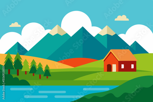 © Robi, Fototapeta premium Serene Mountain Landscape Picturesque Farm House by the Lake