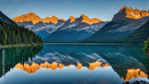 © darion, Fototapeta premium Serene mountain landscape reflected in calm waters at sunrise.