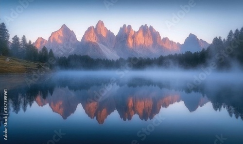 © Pixel, Fototapeta premium Serene mountain landscape reflecting in a calm lake at dawn.