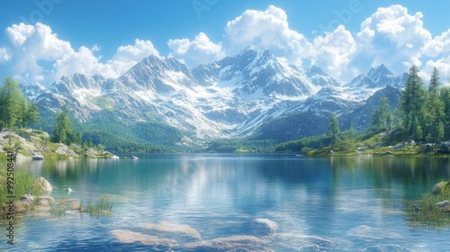 Fototapeta premium Serene mountain landscape with a calm lake and vibrant greenery.
