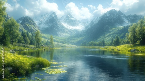 Fototapeta premium Serene mountain landscape with a reflective river and lush greenery.