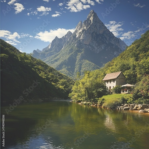 Fototapeta premium Serene mountain landscape with a tranquil river and a rustic house.