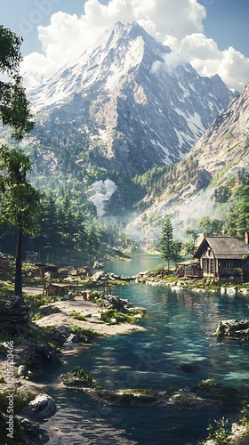 Fototapeta premium Serene mountain landscape with a tranquil river and rustic cabin.