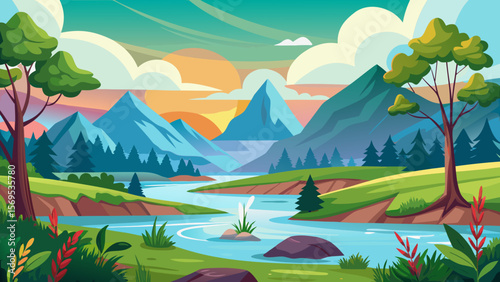 Obraz premium Serene mountain landscape with a winding river at sunset with colorful sky
