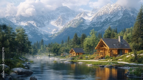 © julio, Fototapeta premium Serene mountain landscape with cabins by a tranquil river.