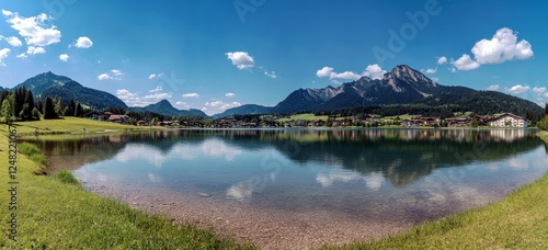 © BonzEarthsnapper, Obraz premium Serene Mountain Landscape with Clear Reflections and Blue Sky over Tranquil Lake Surrounded by Lush Green Hills and Scenic Alpine View