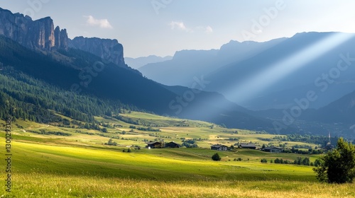 Obraz premium Serene Mountain Landscape with Lush Green Valley Under Dramatic Sky and Sunbeam