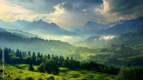 © Kanika Graphic, Obraz premium Serene Mountain Landscape with Lush Green Valleys and Clouds