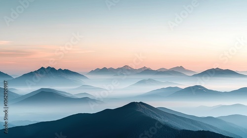 © Tin, Obraz premium Serene mountain landscape with mist and soft pastel sky at sunrise.