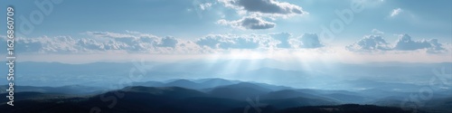 Fototapeta premium Serene mountain landscape with sunbeams and cloudy sky
