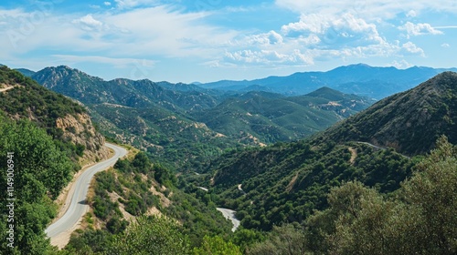 © euthan, Naklejka premium Serene Mountain Landscape with Winding Road and Blue Sky