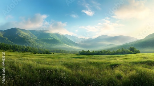 © Ariep, Fototapeta premium Serene Mountain Meadow at Sunrise