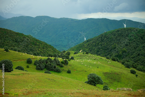 © 大爷 倪, Obraz premium Serene Mountain Meadow with Distant Wind Turbines under Blue Sky