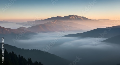 Fototapeta premium Serene mountain peaks emerge from misty clouds at dawn, inspiring awe and...