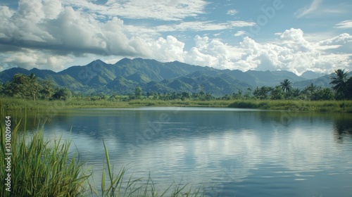© Khoeriyah, Naklejka premium Serene Mountain Pond Landscape, Reflecting Clouds